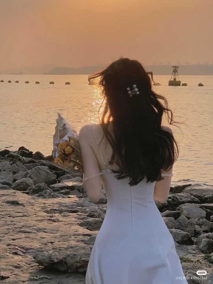 Cô gái trong chiếc váy trắng ngồi bên biển