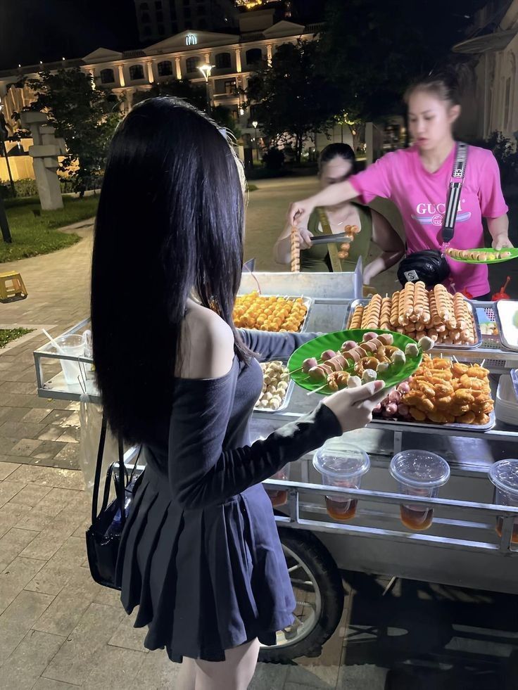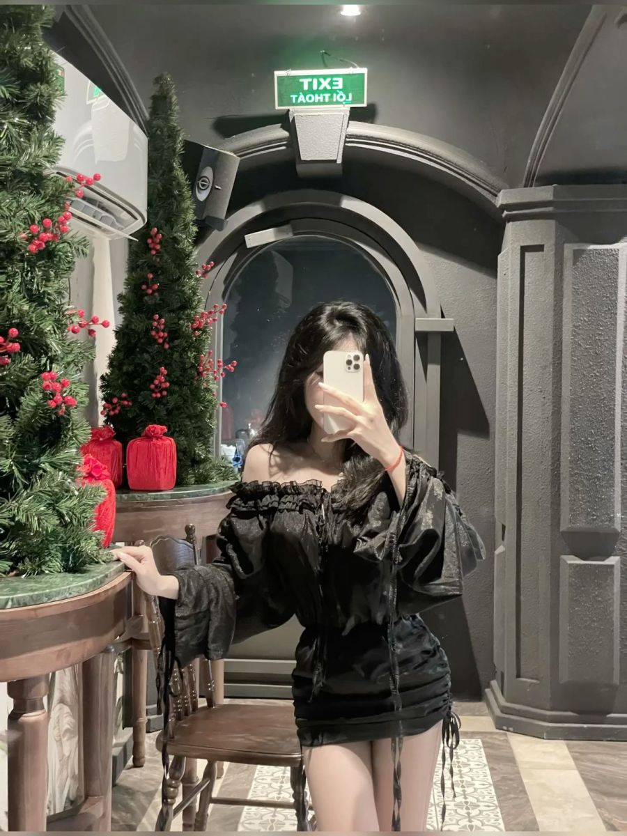 Cô Gái Đứng Bên Quầy Đồ Ăn Mặc Váy Ngắn Màu Đen