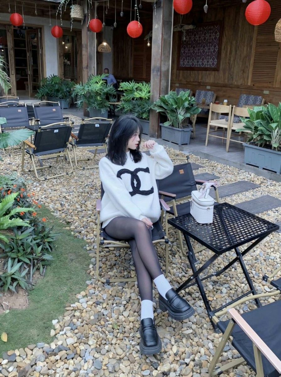 Cô Gái Xinh Đẹp Trong Áo Sweater Trắng Logo Chanel