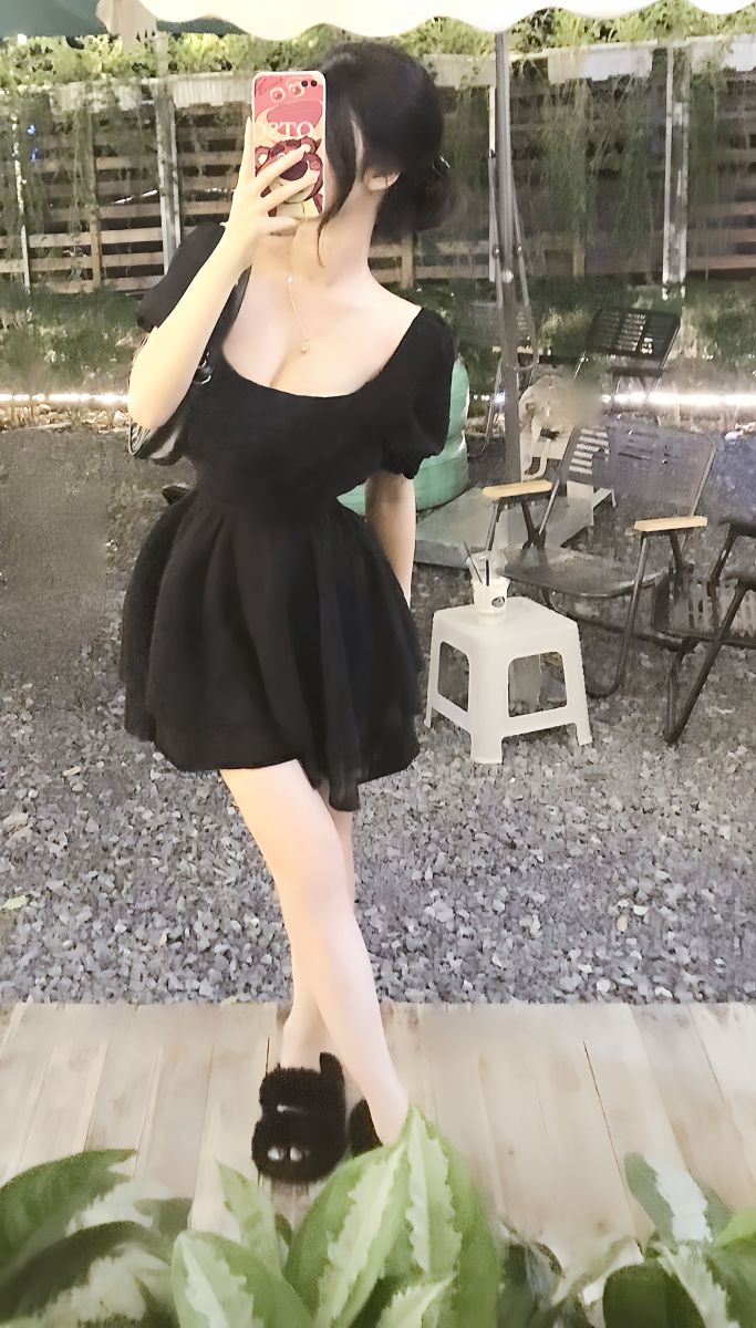 Cô gái trẻ mặc váy đen xòe chụp selfie giữa thiên nhiên