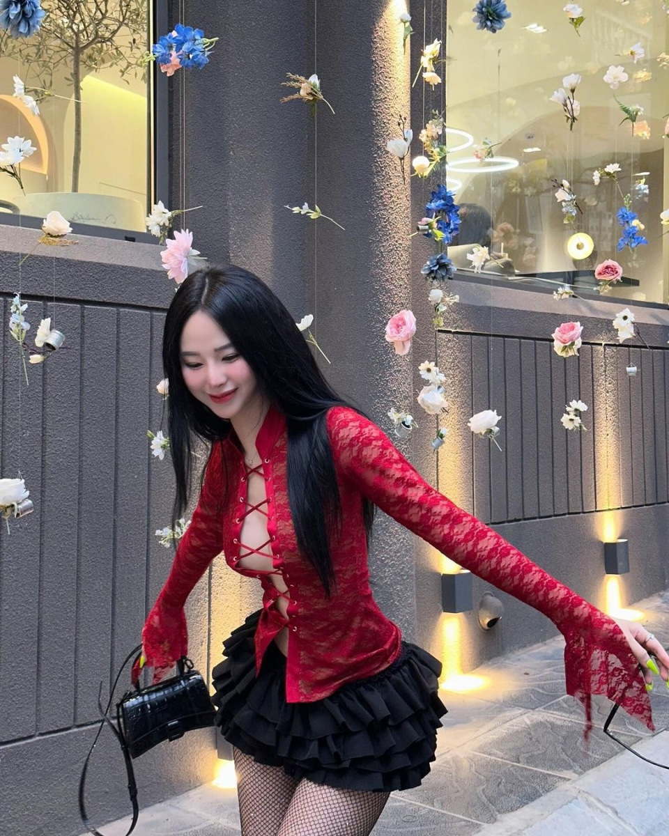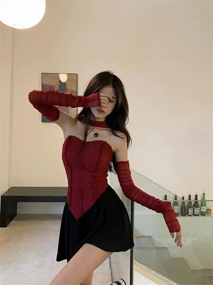 Cô gái xinh đẹp với áo croptop đỏ và chân váy đen trên cầu thang