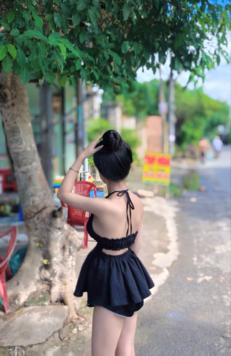 Gái trẻ mặc bikini đen bên cây xanh trên phố