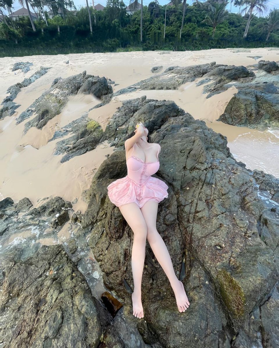 Gái trẻ mặc váy hồng ngồi bên bờ biển thư giãn