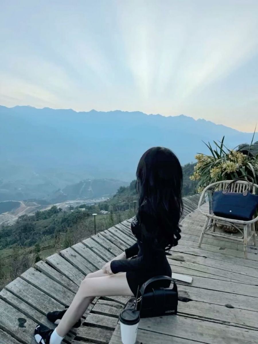 Cô gái mặc áo thun đen, ngồi ngoài trời chiều