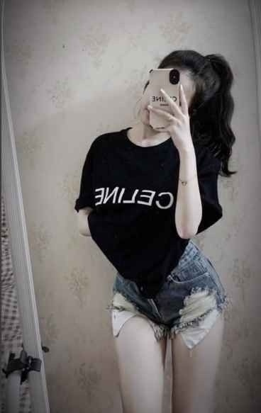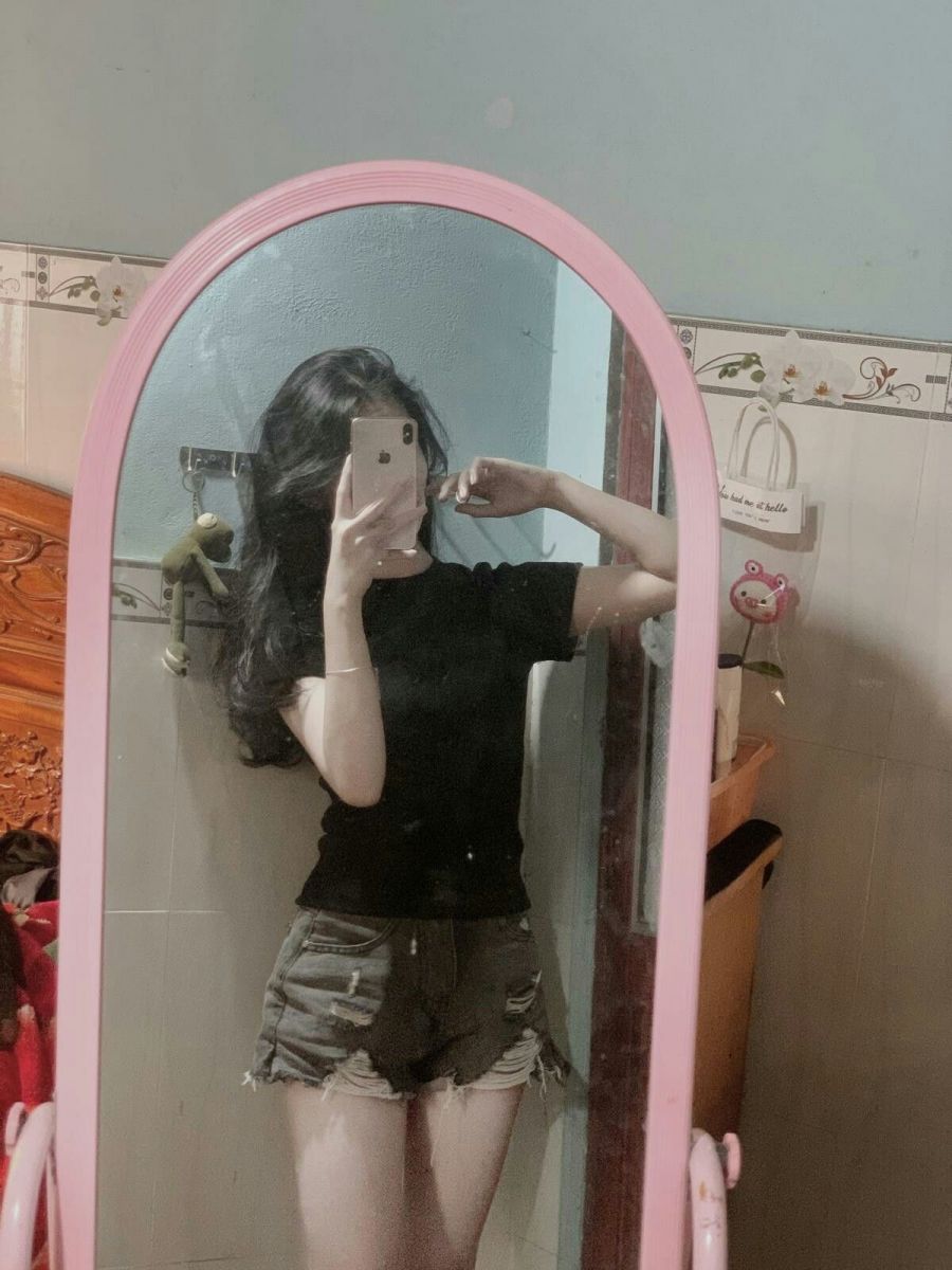 Gái trẻ với áo phông đen và quần shorts rách tạo dáng trong gương