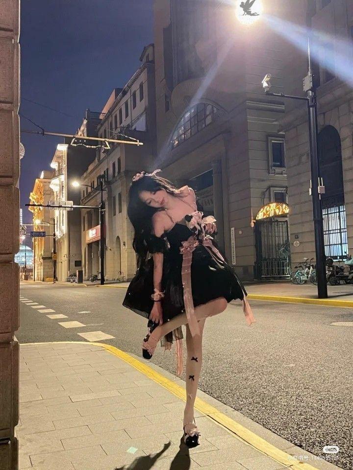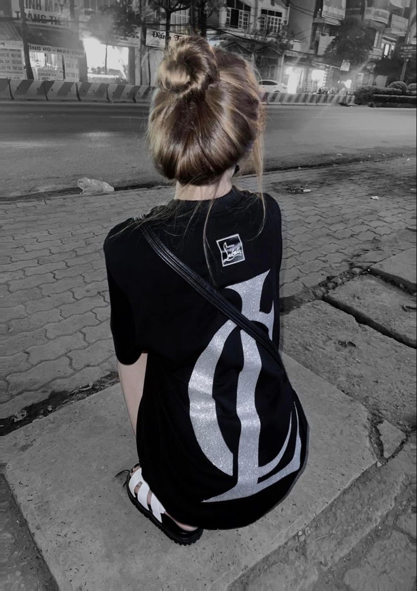 Gái xinh mặc áo thun đen in logo trên phố đêm lãng mạn