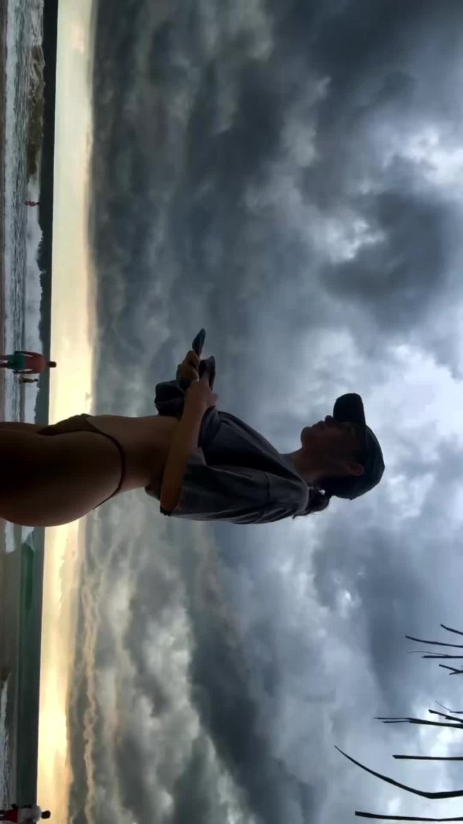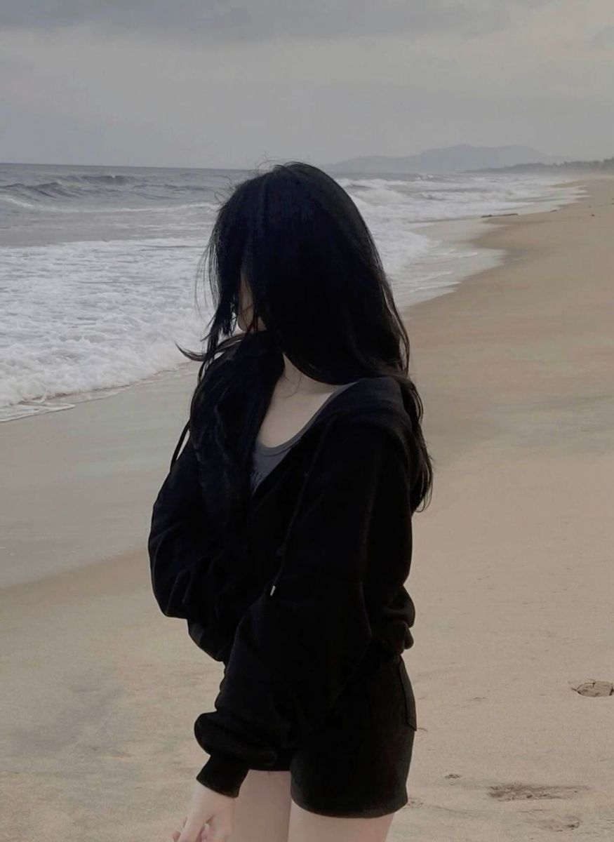 Ảnh gái trẻ mặc áo hoodie đen và quần shorts bên bờ biển