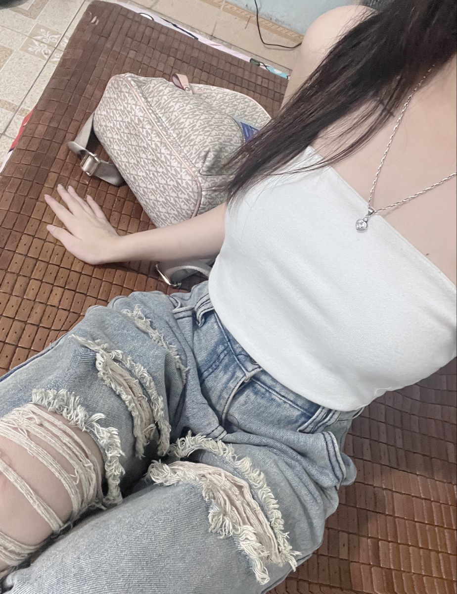 Ảnh gái trẻ mặc áo sát nách trắng và quần jean rách