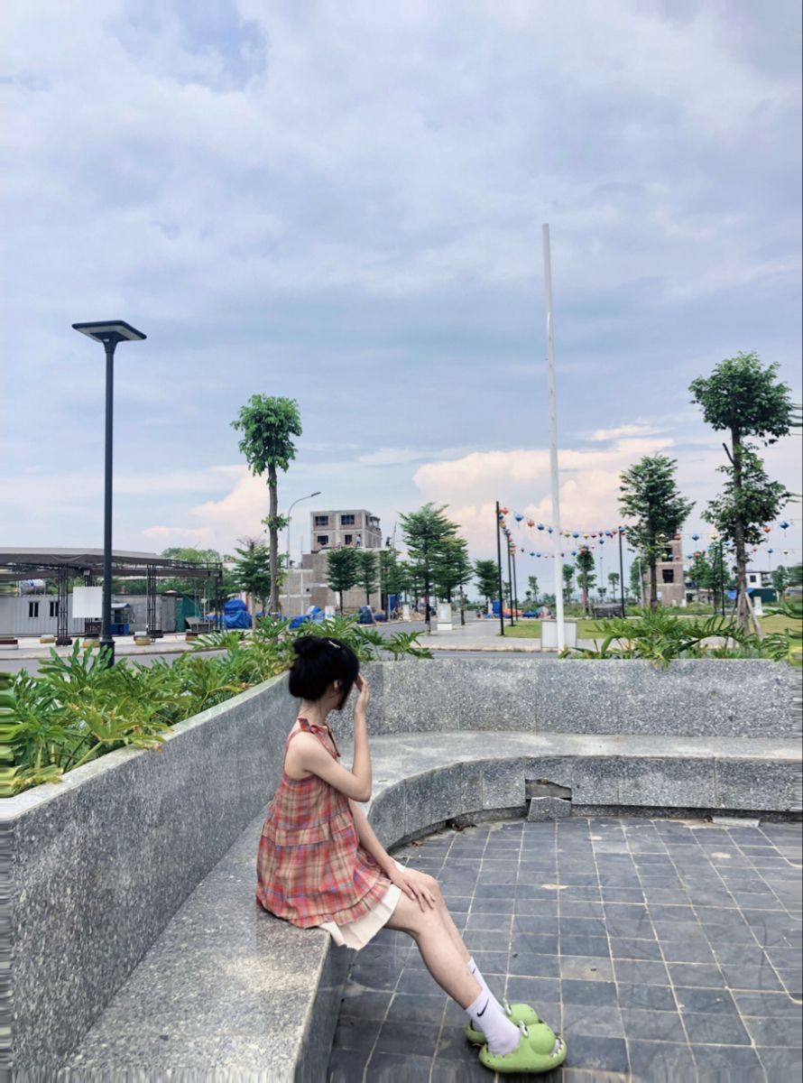 Ảnh gái trẻ mặc váy bèo ngồi thư giãn trong công viên