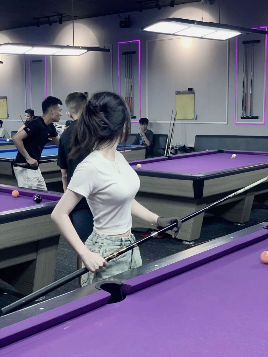 Cô gái mặc áo phông trắng và quần shorts cam tại bàn bi-a