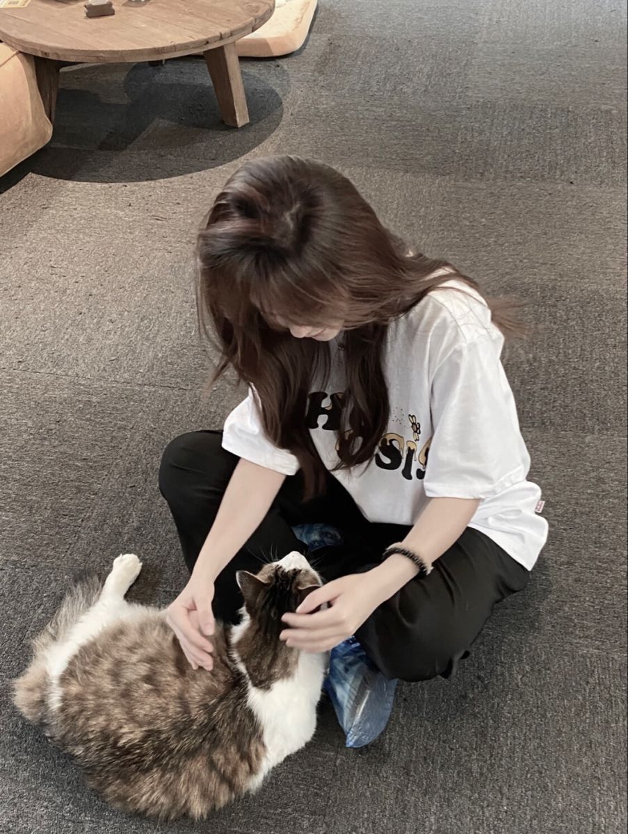 Gái xinh mặc áo phông trắng và quần ngắn trong quán cà phê