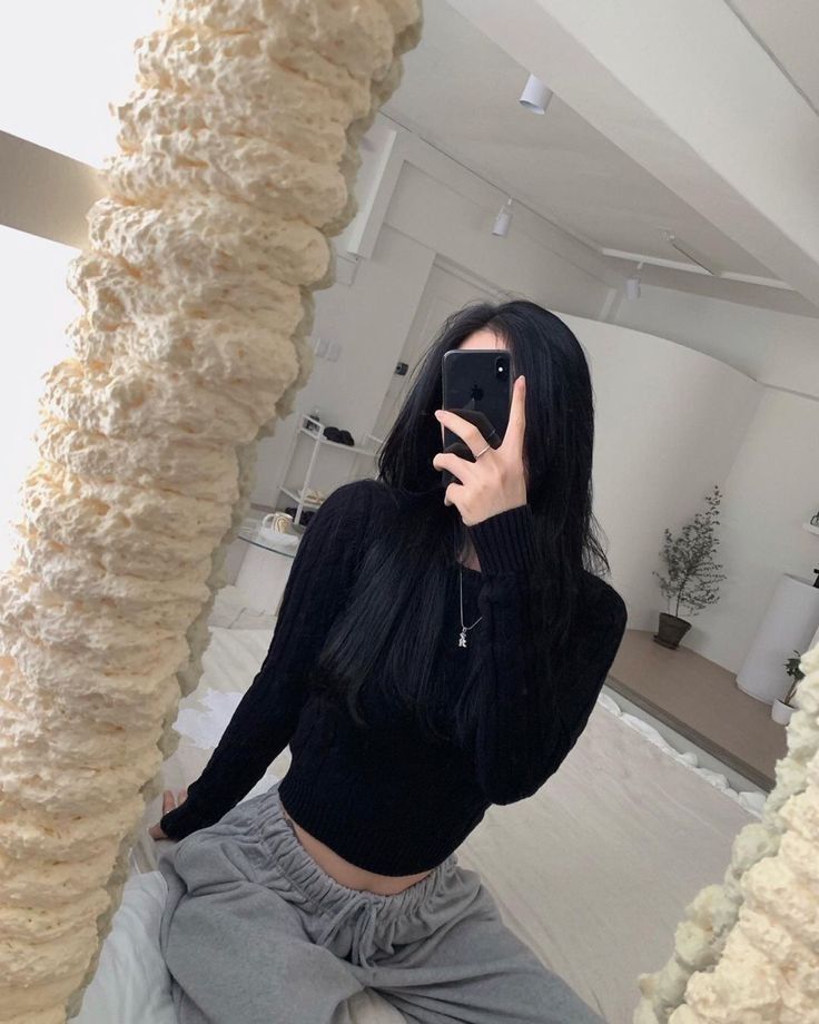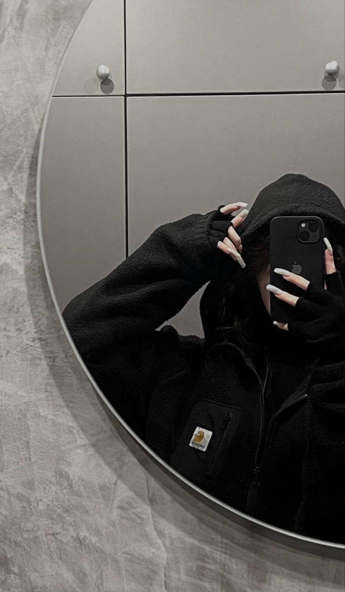 Gái trẻ mặc áo hoodie đen chụp ảnh selfie tự tin trước gương
