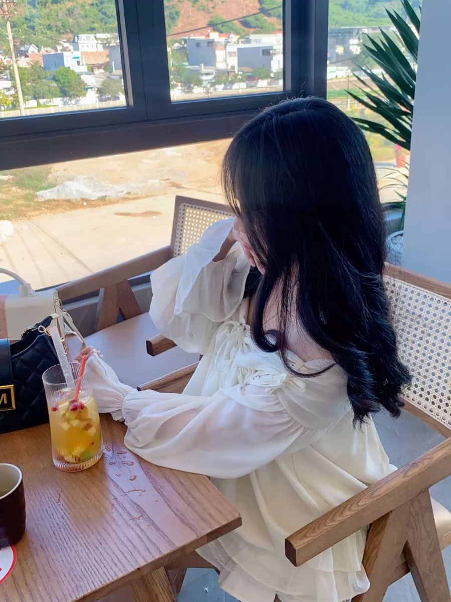 Ảnh gái trẻ mặc áo blouse trắng trong quán cafe