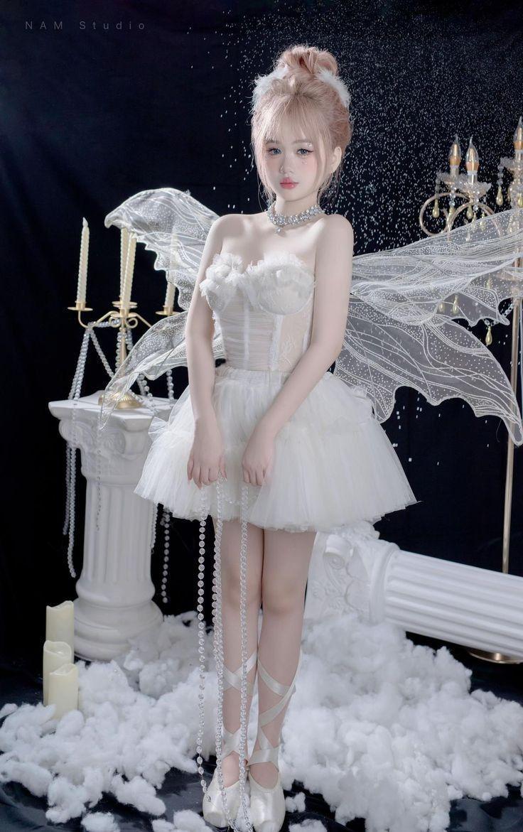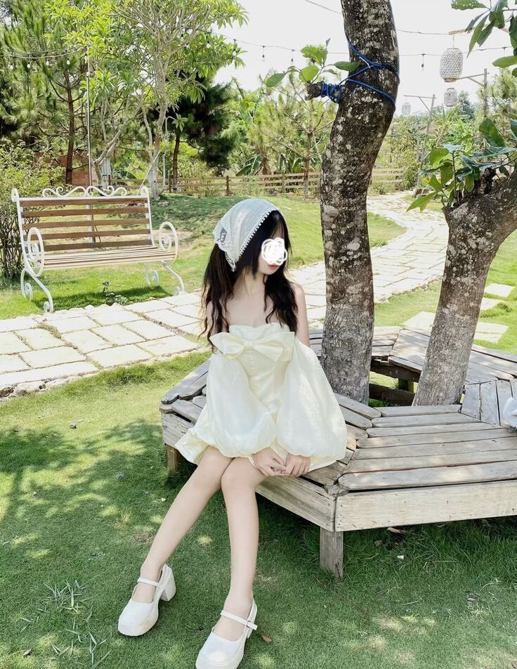 Ảnh gái xinh mặc váy trắng và đeo khẩu trang