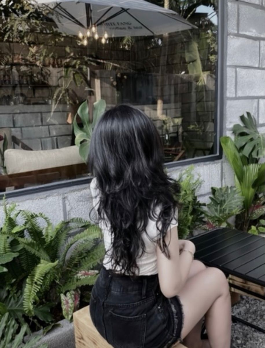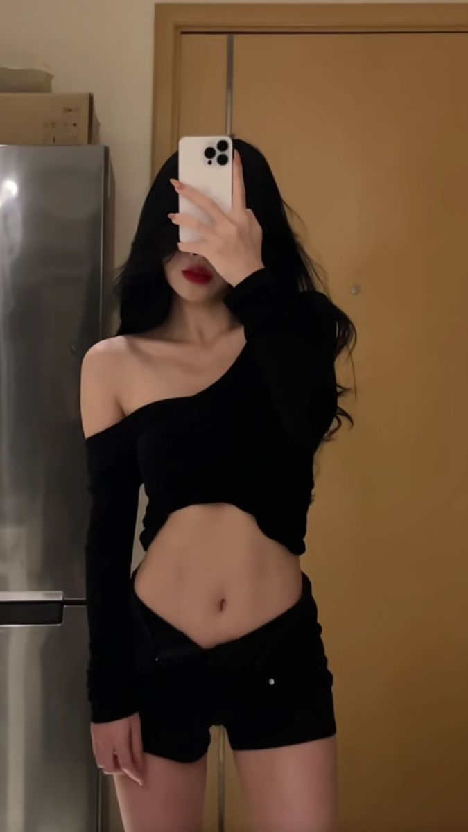 Ảnh gái trẻ mặc áo đen tạo dáng tự tin bên tay nâng lên gần mặt