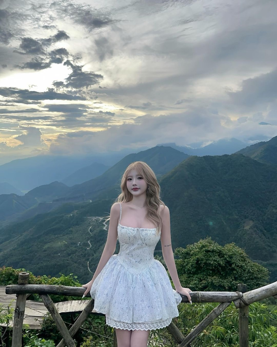 Gái đẹp mặc váy trắng xòe giữa không gian xanh